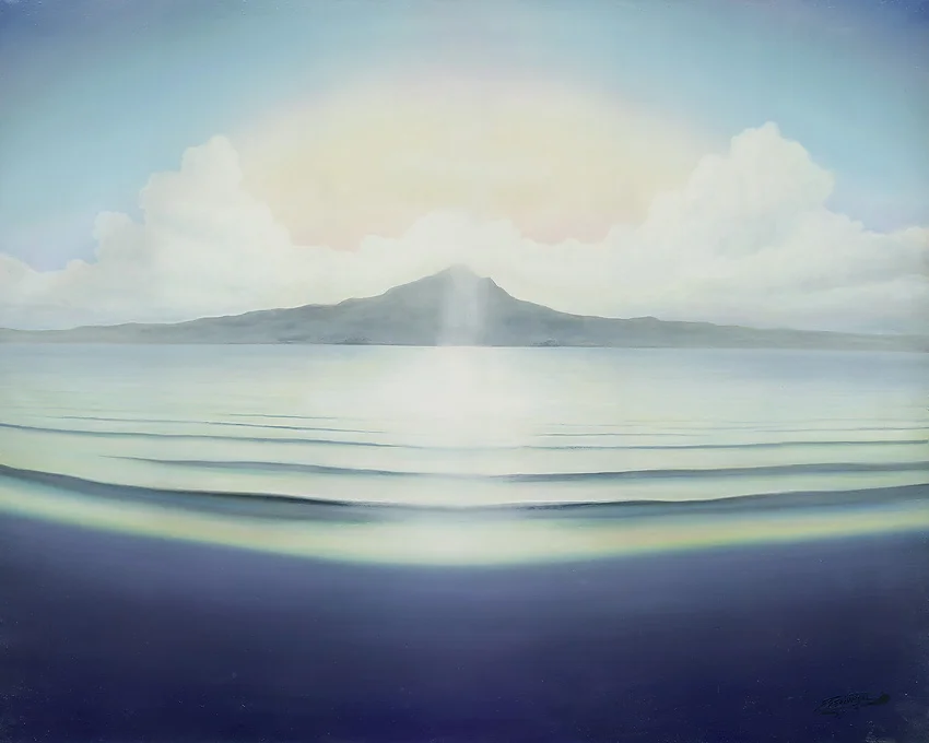 Die Farbpalette spielt eine entscheidende Rolle in der Interpretation des Bildes. Das tiefblaue Wasser strahlt Ruhe und Spiritualität aus und symbolisiert die Weite des Geistes und die Tiefe der Seele. Die sanften Wellen auf der Wasseroberfläche verleihen der Szene eine beruhigende Dynamik und fügen eine lebendige Dimension hinzu.