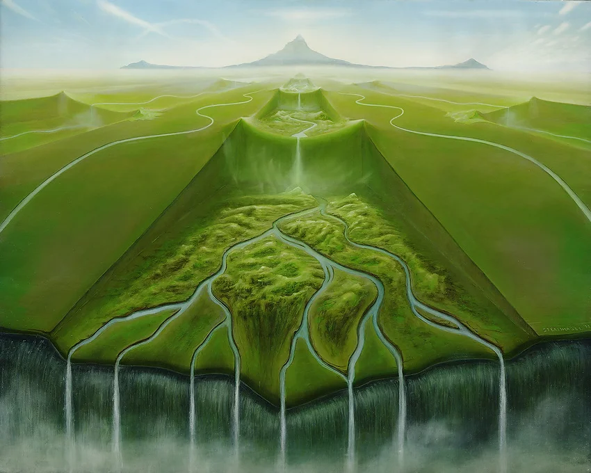 Das Wasser schlängelt sich in sanften, fließenden Kurven und repräsentiert die unaufhaltsame Strömung der Zeit sowie den Übergang von einem Zustand zum anderen. Es erinnert uns an die immense Bedeutung der Geburt als einen Schlüsselmoment im Lebenszyklus, der den Übergang von der intrauterinen Existenz, die durch den nicht eindeutig abgegrenzten Mutterleib symbolisiert wird, zur extrauterinen Existenz markiert. Die treppenartigen Stufen könnten als metaphorische Darstellung der verschiedenen Lebensphasen oder der vorgeburtlichen Zustände gedeutet werden, was die Vielschichtigkeit des Gemäldes unterstreicht.