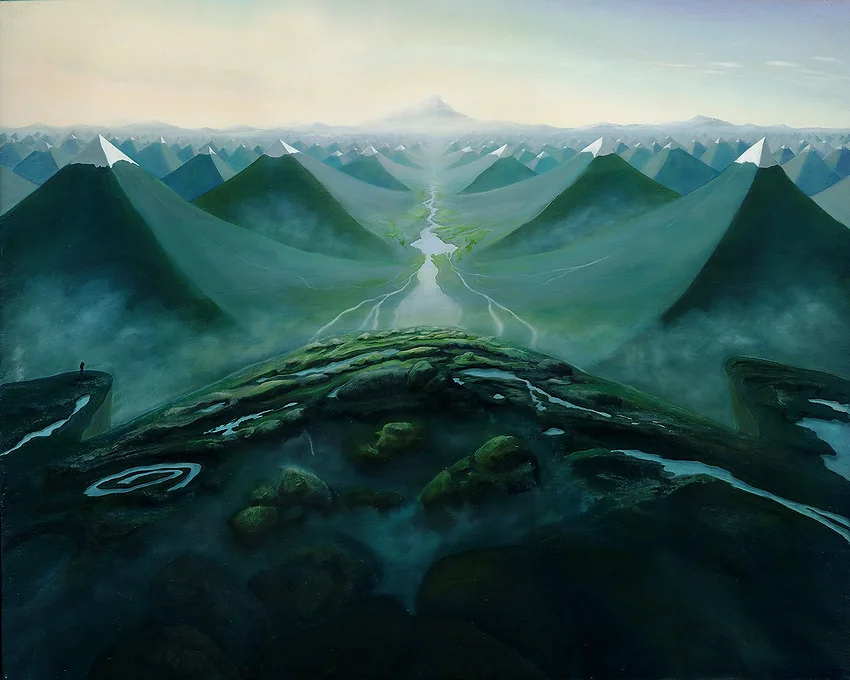 Das Gemälde präsentiert eine eindrucksvolle Darstellung der räumlichen Tiefe und entführt den Betrachter in eine weitläufige Landschaft mit mehreren interessanten Ebenen. Der Künstler hat hier eine delikate Technik verwendet, bei der entlang der Horizontlinie zahlreiche dreieckige Erhebungen in meisterhafter Öl-auf-Leinwand-Malerei festgehalten wurden.