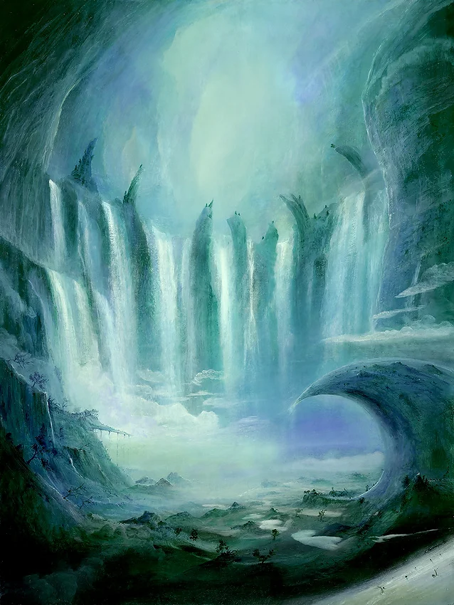In diesem Gemälde erstreckt sich eine erfundene Szenerie in verschiedenen Grüntönen und Grauschattierungen. Der Betrachter blickt von unten auf eine Vielzahl tosender Wasserfälle, die wie märchenhafte Realität wirken. Das Wasser stürzt in wilden Kaskaden von den Felsen, während sich eine tiefe Schlucht darunter auftut. Felswände rahmen die Szene ein und fangen die Feuchtigkeit der Wasserfälle in ihren schroffen Vertiefungen auf. In der Schlucht ziehen dichte Wolkenschwaden, die das Licht des Himmels reflektieren und eine helle Atmosphäre schaffen.