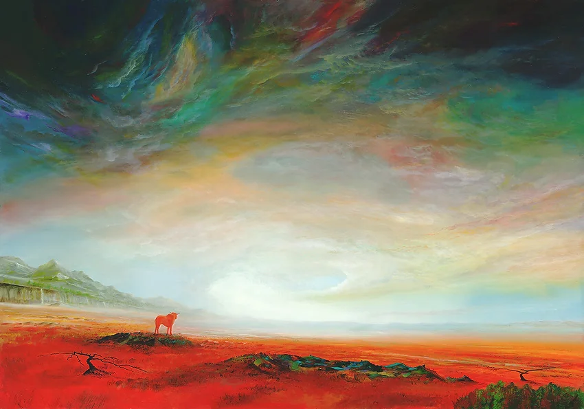 Insgesamt strahlt das Gemälde "Der Rote Stier" eine Aura von Energie, Naturgewalt und Schönheit aus. Es lädt den Betrachter dazu ein, über die tiefere Bedeutung von Stärke, Natur und die Beziehung zwischen Mensch und Tier nachzudenken. Der rote Stier selbst fungiert als Symbol für diese Gedanken und vermittelt die Botschaft einer kraftvollen Existenz in der natürlichen Welt.