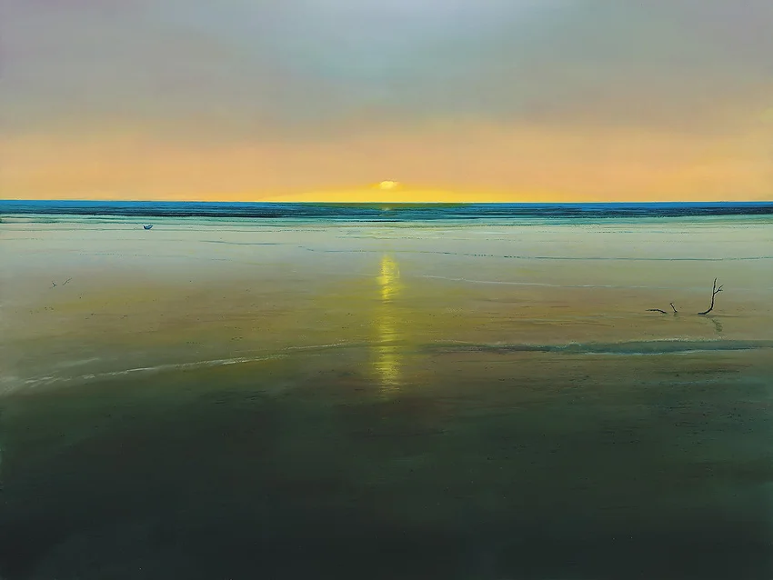 Der Horizont, der in die Ferne reicht, eröffnet unendliche Möglichkeiten und lädt den Betrachter ein, über die Grenzen des Bildes hinaus zu träumen. Insgesamt erzeugt das Gemälde eine meditative Atmosphäre und erinnert den Betrachter an die Schönheit der Natur und die Ruhe, die sie schenken kann. Es lädt dazu ein, innezuhalten um zu erkennen, dass die Natur selbst zur Meditation neigt, die Stille den Moment einnimmt, während die Sonne langsam hinter dem Horizont verschwindet und die Welt in Dunkelheit hüllt.