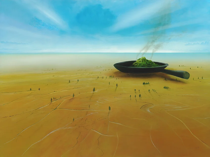 Das Gemälde präsentiert eine künstlerische Darstellung der Erderwärmung und ihrer katastrophalen Auswirkungen auf die Umwelt. In einem ausgetrockneten und scheinbar leblosen Landstrich, abgesehen von winzigen Bäumen, steht eine riesige Pfanne, in der ein Stück Erde erwärmt wird. In dieser Pfanne wird die Erde, symbolisiert durch einen Berg, buchstäblich gebraten. Der Rauch, der aus der Pfanne aufsteigt, verweist auf die unheilvollen Folgen dieser Überhitzung.