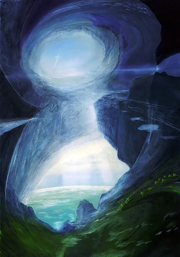 In der unteren Ebene erkennen wir die Wölbung des Planeten Erde und Wolkenfetzen, die das irdische Leben repräsentieren. Die untere Öffnung könnte den Ausgang aus der Höhle in die Welt symbolisieren, die wir kennen und erleben.