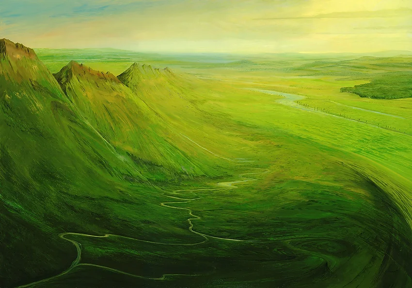 Ein schlängelnder Fluss mit bläulichem Wasser auf der rechten Seite verleiht der Szene eine beruhigende Atmosphäre. Das Flussbett führt den Blick des Betrachters weiter in die Ferne und bietet eine natürliche Führung durch das Gemälde. In der Ferne erstreckt sich ein Gebirge, das wie eine endlose Kette von Bergen den Horizont durchzieht. Dieses Gebirge verleiht der Landschaft eine imposante und wohltuende Note und bietet Raum für Entdeckungen.