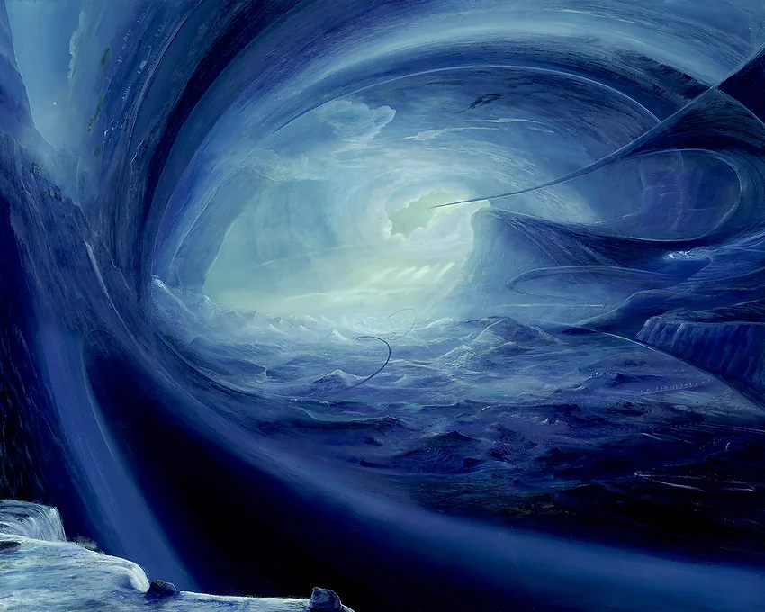 Besonders auffällig ist das helle Licht, das am Ende dieses Röhrensystems strahlt, und dabei einen starken Kontrast zu dem dominierenden kühlen Blau bildet. Dieses Licht symbolisiert vielleicht eine Quelle der Klarheit und Erkenntnis innerhalb dieser bewegten Welt. Die verschiedenen Ebenen und die ungewöhnliche Formgebung lassen den Betrachter eintauchen in eine surreale Welt, in der die Naturgesetze neu zu gelten scheinen. Die Abwesenheit von geraden Linien und die organische Formgebung vermitteln den Eindruck von Lebendigkeit und Wachstum, während das strahlende Licht Hoffnung und Offenbarung suggeriert.