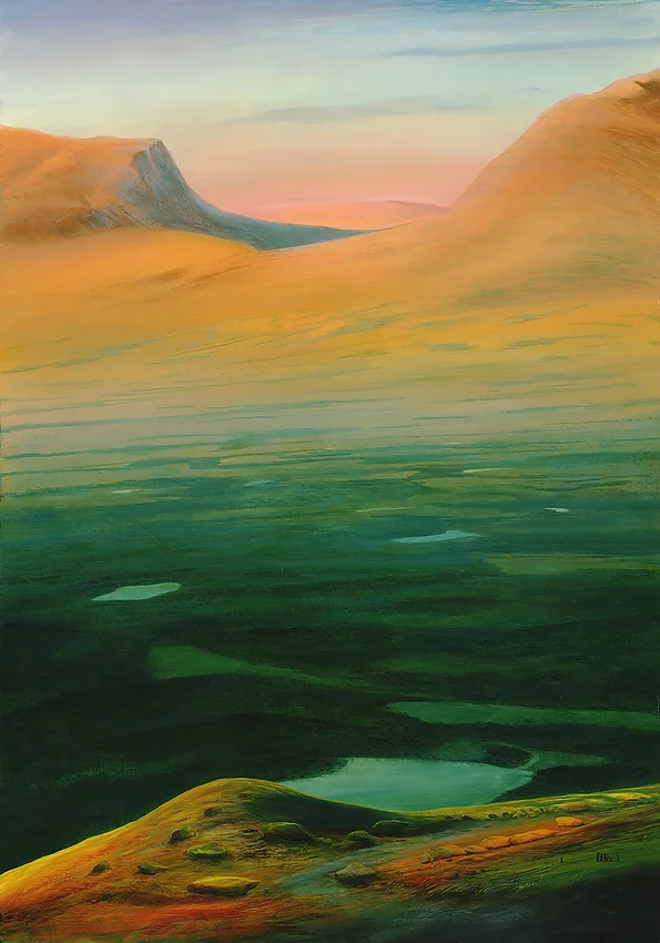 Der Himmel darüber ist in einem zarten Rosarot getaucht, das eine warme und beruhigende Atmosphäre schafft. Das warme orangefarbene Licht, das durch den Dunst hindurchscheint, verleiht dem Gemälde eine sanfte Leuchtkraft und verstärkt das Gefühl von Wärme und Geborgenheit. Die Farbgebung des Himmels und das sanfte Licht verstärken das Gefühl der Ruhe und des inneren Friedens, während der Betrachter in die unendliche Aussicht und die majestätische Schönheit der Berge eintaucht.