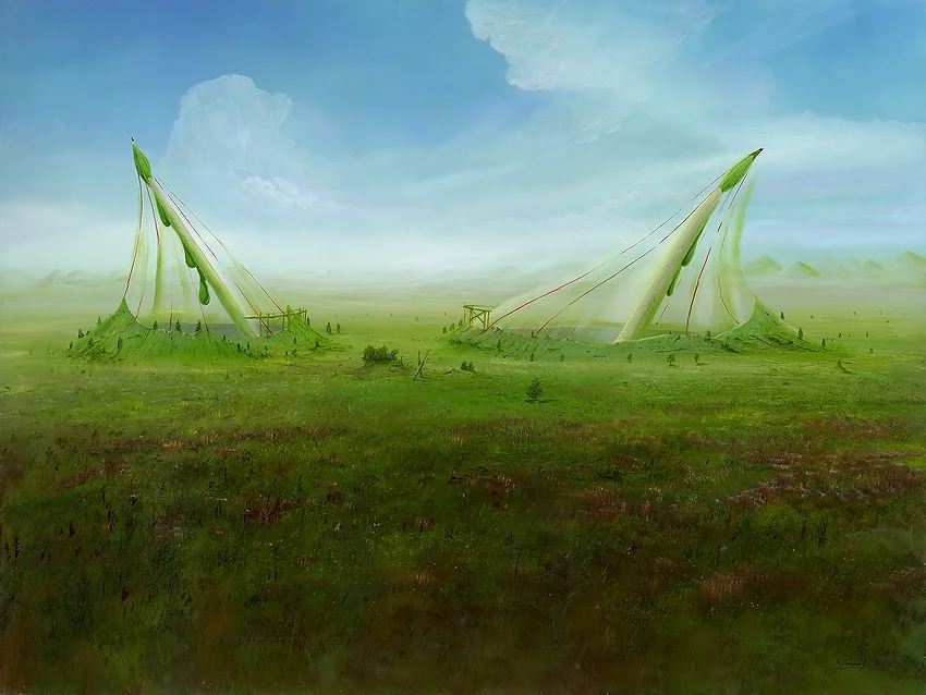 Dieses Gemälde entführt den Betrachter in eine surreale Welt, in der die Grenzen zwischen Natur und Kunst verschwimmen. Aus tiefen Erdvertiefungen ragen Pinsel empor, deren Borsten mit Farben getränkt sind, die Fäden ziehen. An den Pinselstilen bilden sich farbige Tropfen.