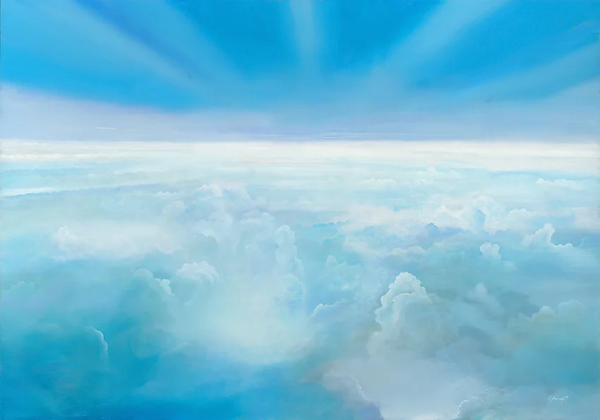 In diesem Gemälde scheint der Betrachter in eine andere Welt entrückt zu sein, da der Blick über die Wolken in die Unendlichkeit schweift. Die Wolken, die in verschiedenen Schattierungen von Weiß und minimalen Grau dargestellt sind, schaffen eine flauschige Atmosphäre und vermitteln das Gefühl von Leichtigkeit und Freiheit. Der Himmel erstreckt sich in einem sanften Blau, das die Szenerie mit einer beruhigenden Energie erfüllt.