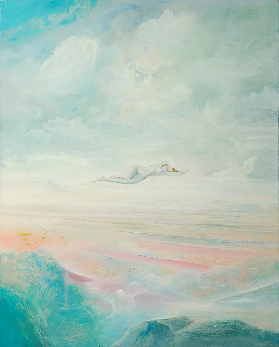 Insgesamt strahlt dieses Gemälde eine Aura der Ruhe und des inneren Friedens aus, während es die Betrachter dazu einlädt, sich in die Schwerelosigkeit der Fantasie und des Traums zu begeben. Es lädt dazu ein, die spirituelle Dimension des Lebens zu erkunden und die Schönheit des Losgelöstseins von der physischen Welt zu schätzen.