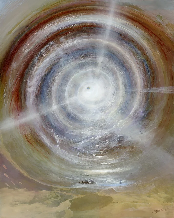 Dieses faszinierende Gemälde eröffnet eine Welt jenseits unserer Vorstellungskraft, eine Welt, die sich in einer riesigen Spirale in die Unendlichkeit windet. Im Mittelpunkt dieser Wirbelbewegung erscheint ein winziger Punkt, unser Heimatplanet Erde, von einem zarten Licht umgeben. Dieser Kontrast zwischen der winzigen Erde und der majestätischen Spirale erzeugt ein Gefühl der Demut und lässt den Betrachter über die unermessliche Weite des Universums nachdenken.