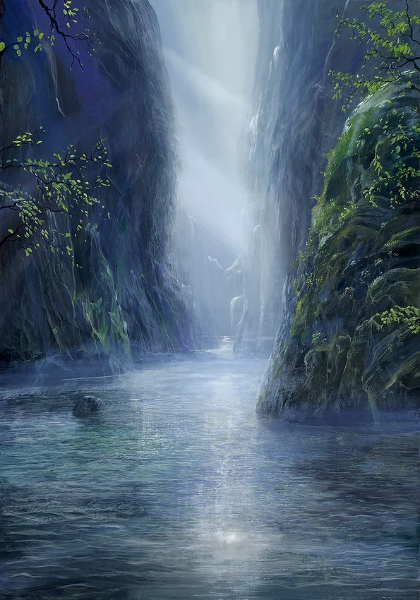 Die Felsen, die diese Szene bilden, sind in einem tiefen Blauton gehalten, der eine magische Dimension hinzufügt. Diese blauen Felsen heben sich von dem sanften Licht und den grünen Blättern ab und erzeugen einen starken visuellen Kontrast.