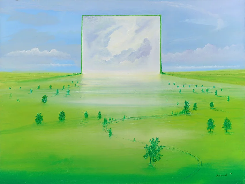 Das Gemälde präsentiert eine beeindruckende Reflexion über die Natur der Kunst selbst. Die zentrale Szene zeigt eine malerische Landschaft, aber in ihrer Mitte ragt eine riesige Leinwand oder Werbetafel auf, die einen Himmel mit Wolken darstellt.