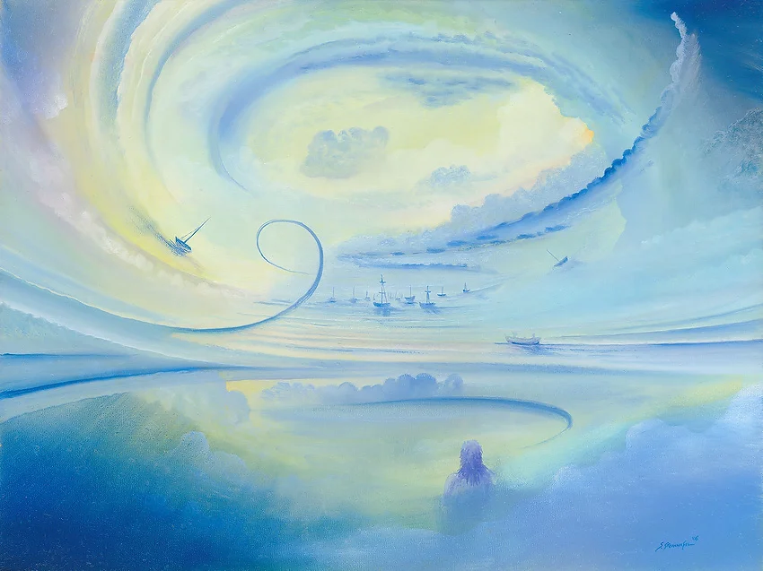 Im Zentrum des Bildes befindet sich ein Meer, das von leichten langen Wellen durchzogen ist. Diese Wellen symbolisieren die unaufhörliche Bewegung und Veränderung der Natur. Auf den Wellen schwimmen Schiffe, vielleicht bemannt, vielleicht unbemanntn, die sich inmitten dieser dynamischen Umgebung mit Spiralen und Fliehkräften behaupten. Die Anwesenheit der Schiffe und des Menschen im Vordergrundverleiht dem Gemälde eine spezifische Note und erinnert daran, wie der Mensch in die Natur eintaucht und mit ihr interagiert.
