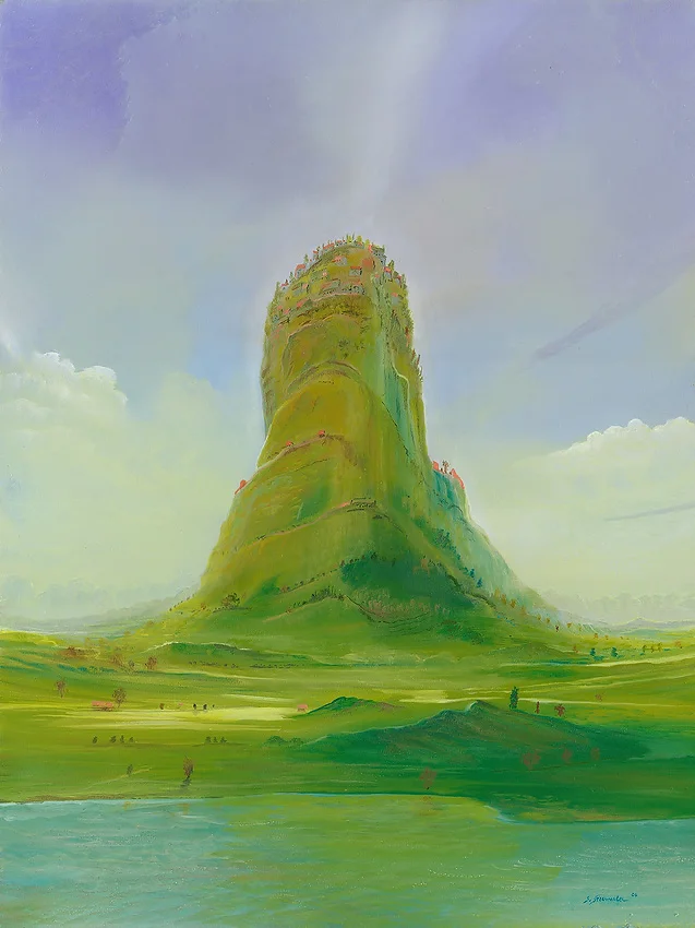 Von den Häusern auf dem Berg hat man je eine Aussichtsplattform. Auf dem Berg liegt eine malerische Stadt. Lichtstrahlen gehören zu der Komposition, die scheinbar von dem Berg ausgehen oder durch die Existenz der Erhebung in der vorleigenden Form generiert werden. Diese Lichtspiele verleihen der Szene eine besondere Atmosphäre, als ob die Himmelspartie selbst mit Licht gemalt wurde.