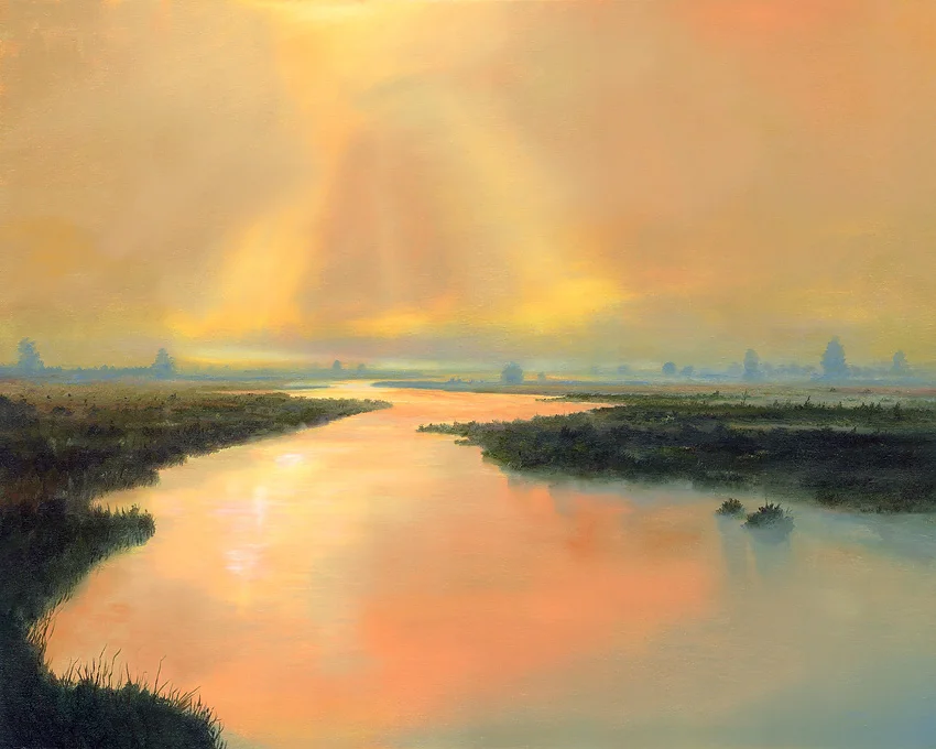 Die Komposition teilt die Szenerie in zwei Teile: den Himmel, der sich über der Wasseroberfläche erstreckt und das Licht wie Schminke annimmt, und das ruhige Gewässer selbst, das in einem warmen Orangeton erstrahlt und die Herbststimmung perfekt einfängt. Die bedächtige Bewegung des Wassers vermittelt ein Gefühl von Gelassenheit und Frieden.